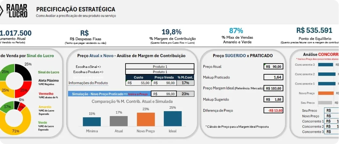 O Radar do Lucro não é mais um curso cheio de teoria difícil. É um método prático apoiado em uma ferramenta simples e visual, que transforma dados confusos em clareza imediata: